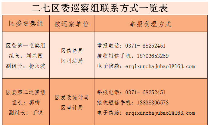 巡察期间,各巡察组均开通值班电话、接收短信手机、电子信箱,在各单位设置联系信箱。(二七区纪委)